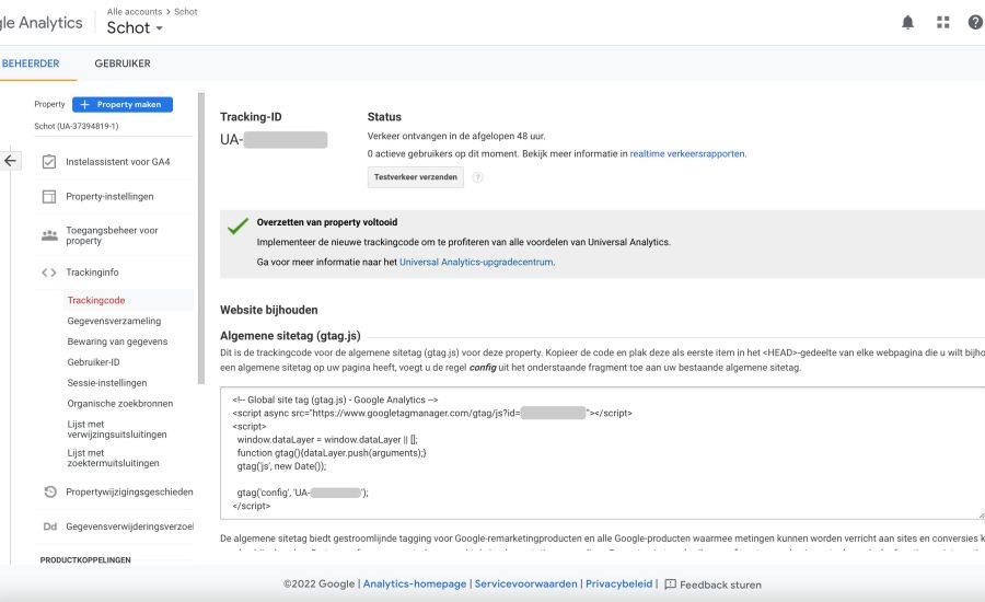 Bij het tabje ‘Trackingcode’ staan alle instructies op de volgende code te plaatsen op je website. Voor sommige themes/builders (Wordpress/Joomla) heb je alleen de code nodig. Deze code begint bijna altijd met UA-…. Als dit niet het geval is krijg je zo’n code te zien: